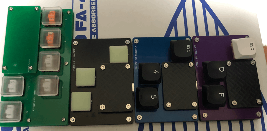 - データシート通り作ったのに、ゆるゆるだった事件があったため、複数の寸法でキーキャップを注文していた。キツすぎたものは無理やりはめたら、スイッチが押し込まれたまま戻ってこなくなり、キャップも外せなくなった → 後日頑張ったら外せた