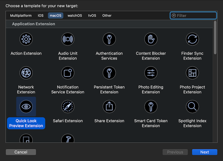 - File - New - Target… から Application Extension の Quick Look Preview Extension を選択