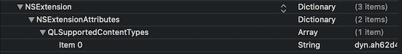 次は Quick Look 機能拡張がプレビューを作成できるファイルの情報をinfo.plistに用意する。