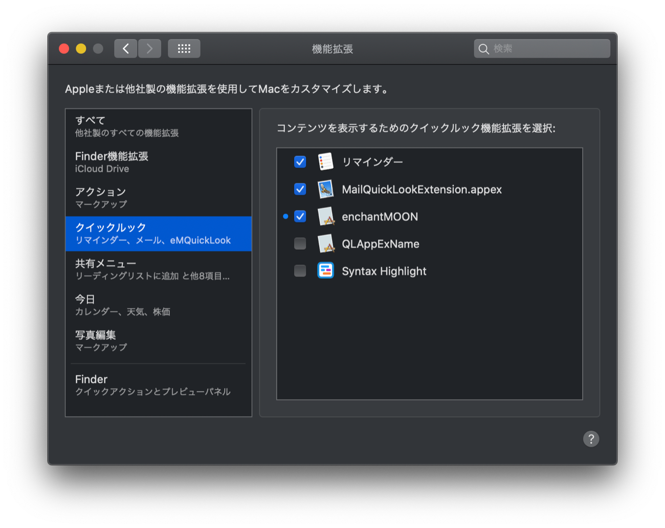 機能拡張のオン/オフは「システム環境設定」の「機能拡張」にある「クイックルック」から行うことができる。