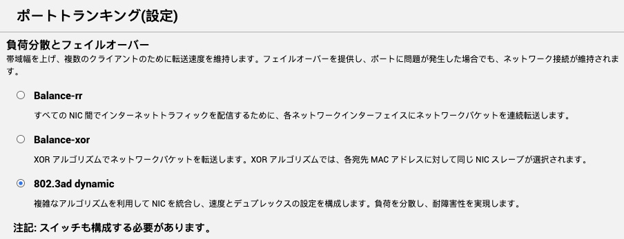 ポートトランキングの詳細設定の中で、このIEEE802.3adという規格がLACPになるため、選択します。