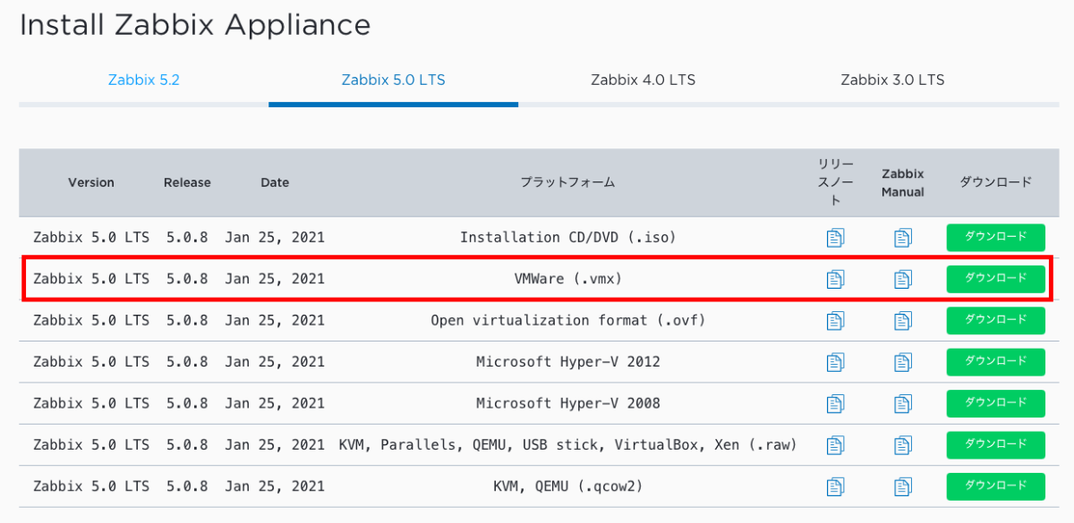 今回はVM用に提供されているApplianceを導入するため、Zabbix 5.0 LTSの 5.0.8の.vmxをダウンロードしました。