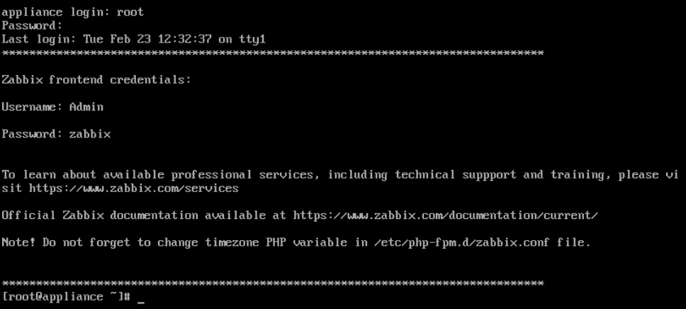 この時点で、すでにZabbixは起動している状態ですが、ブラウザからアクセスする必要があるのでIPを確認します。ちなみにこのアプライアンスはCentOS 8がベースとなっていました。