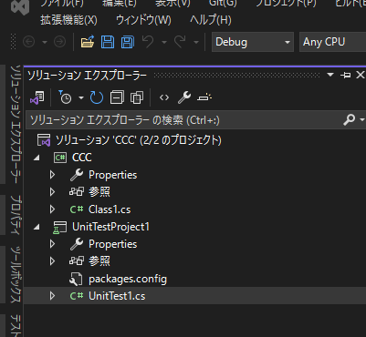 「CCC」という.NETFrameworkのクラスライブラリと、UnitTestProdect1という.NETFrameworkの単体テストプロジェクトがある状態です。
