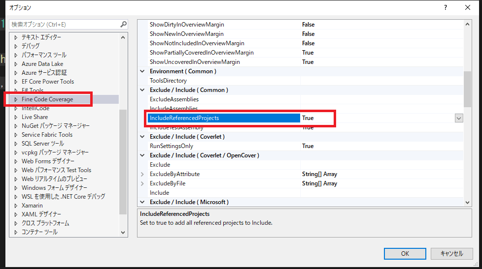 Fine Code Coverageの「IncludeReferencedProjects」をTrueにします。