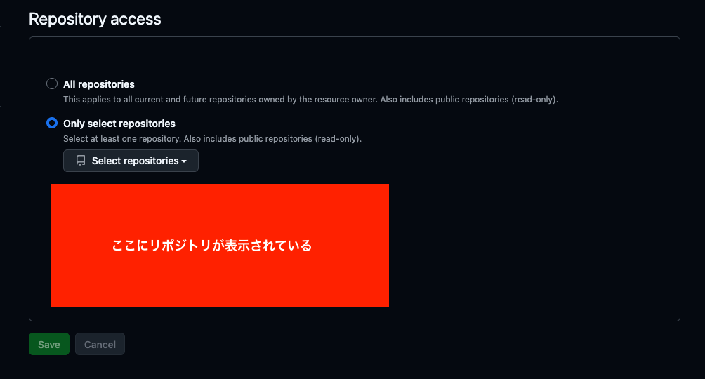 - 「Repository access」というのがあるので、全部のリポジトリを選べるようにしてしまいたいなら「All repositories」。まだ個別にしておきたいなら「Only select repositories」のままで「Select repositories」からVercelに追加したいリポジトリを選択する
