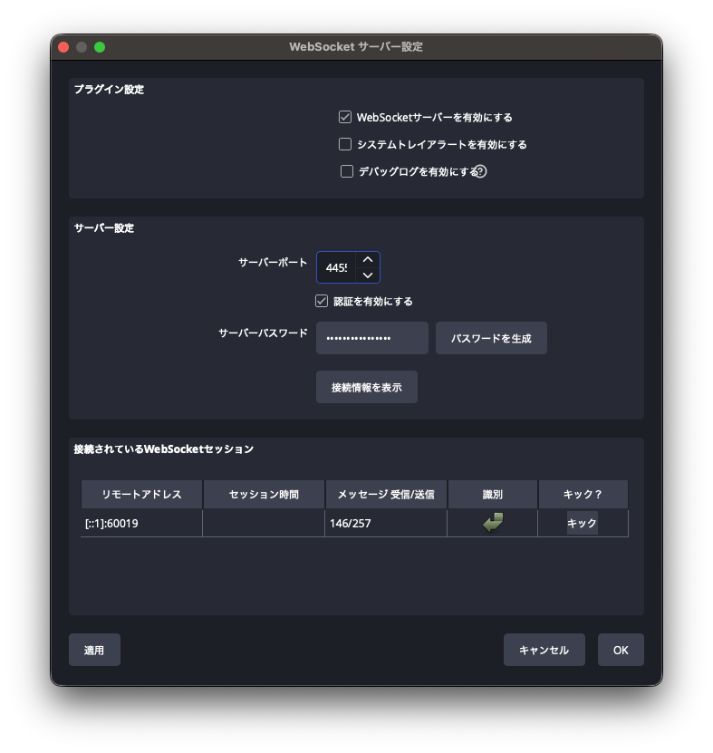 まず、タブから画面を切り替えて、MIDIデバイスの設定、OBSとはWebSocketで通信するので、通信設定などをしてください。あらかじめ、OBSで「ツール」→「WebSocketサーバー設定」から、WebSocketサーバを有効にしておく必要があります(下図のようになってるとOKです)。