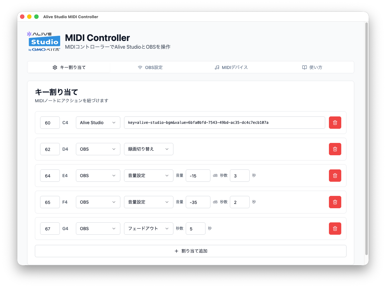その後、Alive Studio MIDI Controllerアプリの設定画面で、MIDIコントローラから送信するノート番号と操作を紐付けます。対象は、OBS本体で行う各種操作と、Alive Studioの各種素材に対する操作です。