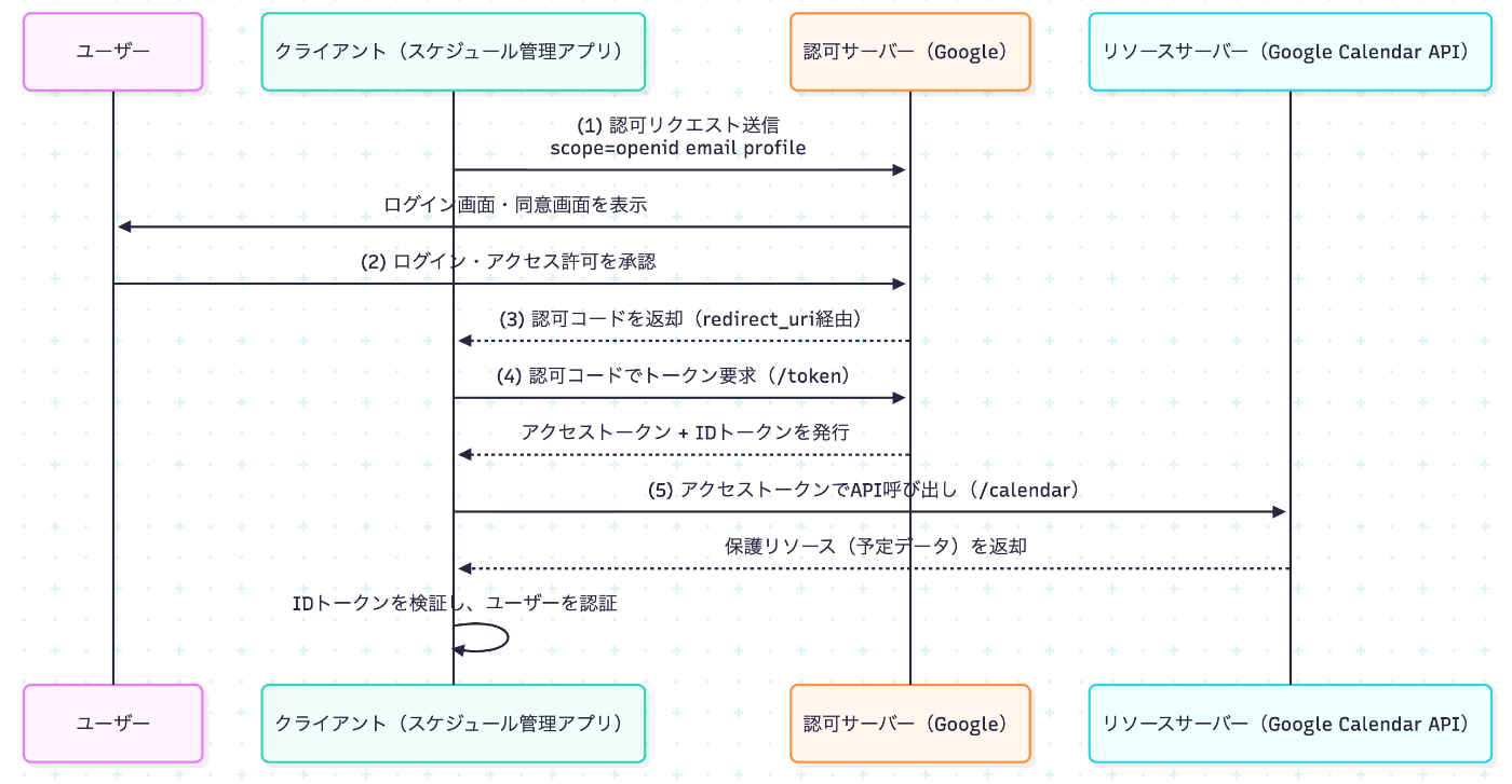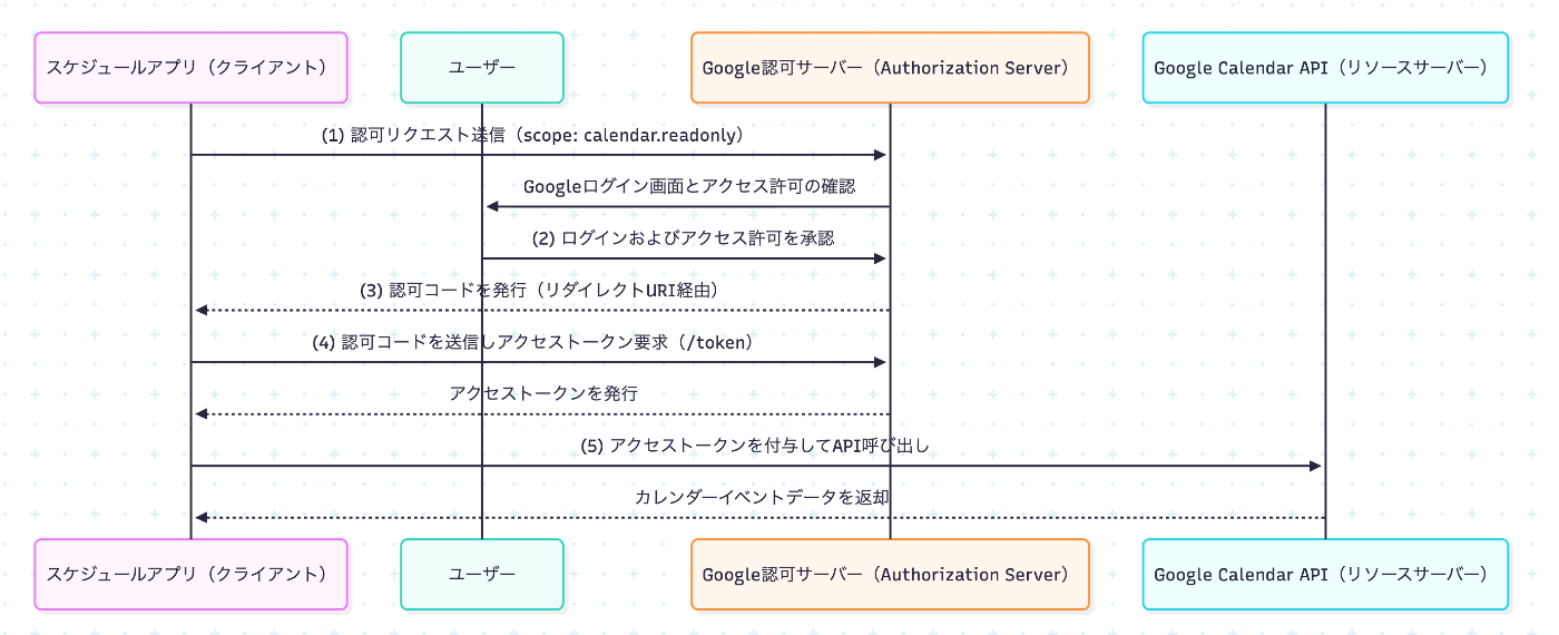 たとえば、上記の例を借り、外部のスケジュール管理アプリ(第三者アプリケーション)がGoogle Calendar API(リソースサーバー)にアクセスする場合を考える。このとき、アプリはユーザーのGoogleアカウントのパスワードを知ることなく、OAuth 2.0のフローを通じて「一時的なアクセス権(アクセストークン)」を取得し、安全にカレンダーデータへアクセスする。