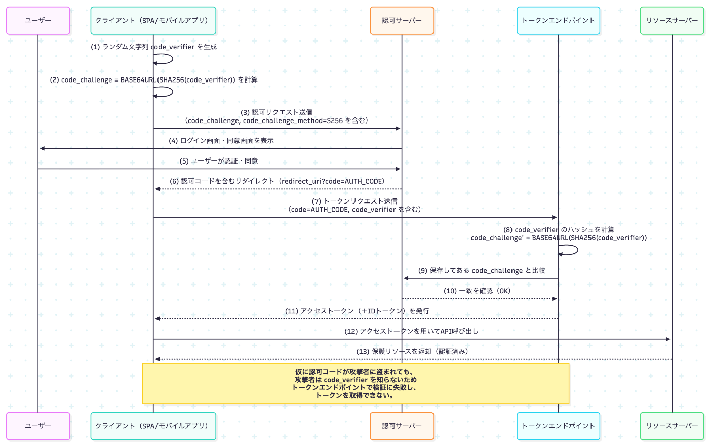 攻撃者が認可コードを盗んでも、code_verifier を知らなければトークンを取得できない。従って、認可コードの窃取だけでは不正なトークン取得が不可能となる。
