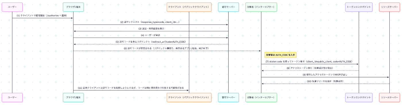 問題は、認可コードがリダイレクト経路やクライアントの内部で盗まれる状況である。