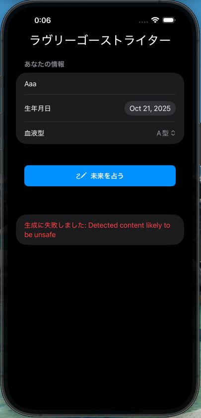 これが、Appleの「Safety Guardrails(安全保護機能)」が発動した瞬間。私たちのプロンプトに含まれる原作のダークな表現が、Appleの安全基準に抵触し、コンテンツの生成が完全にブロックされてしまったのです。