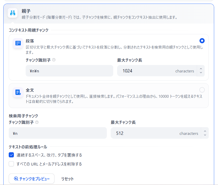 - 特に親子チャンクが簡単に設定できるのが他にはあまりなさそう。親子チャンクとは、PDF等の情報をおおきなまとまりで親と設定、子どもそれをさらに分割して、子供で検索、AIには親を渡す仕組みで、検索には小さい情報がいい、AIに渡すにはそれより大きめの情報がいいという考えのもの。ちょっと試した感じだと自分の設定にもよると思うが、親子チャンクのほうが汎用よりよかった感じ。