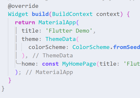 再起動後、Flutterウィジェットのコード(特にbuildメソッド内)を見ると、ネストされたウィジェットの開始タグと終了タグの間に、階層を示す縦線のアウトラインが表示されるようになります。