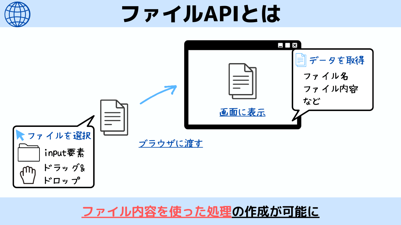 ファイルAPIとは、ブラウザでファイルを受け取り読み取ることができる機能です。対象のファイルはユーザーが選択したものに限られるので、意図しないファイルが読み取れることはありません。
