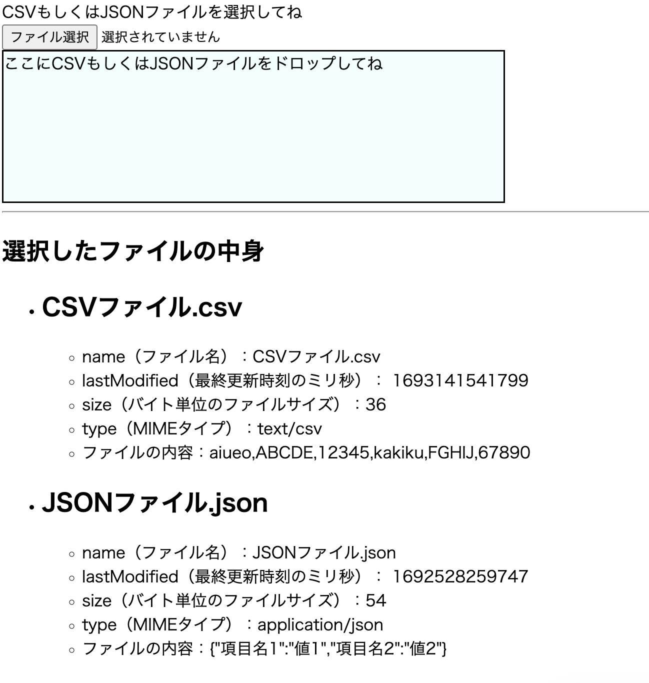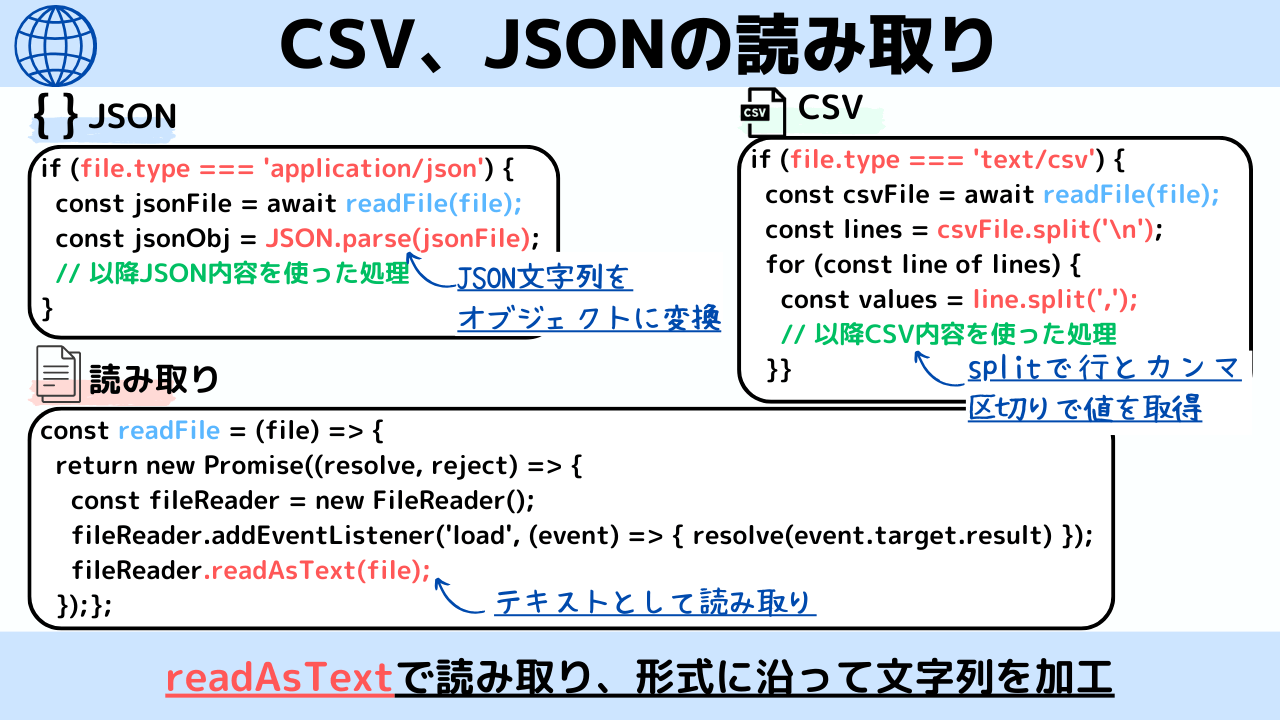 CSVとJSONはどちらもFileReaderオブジェクトのreadAsTextメソッドで読み取ります。