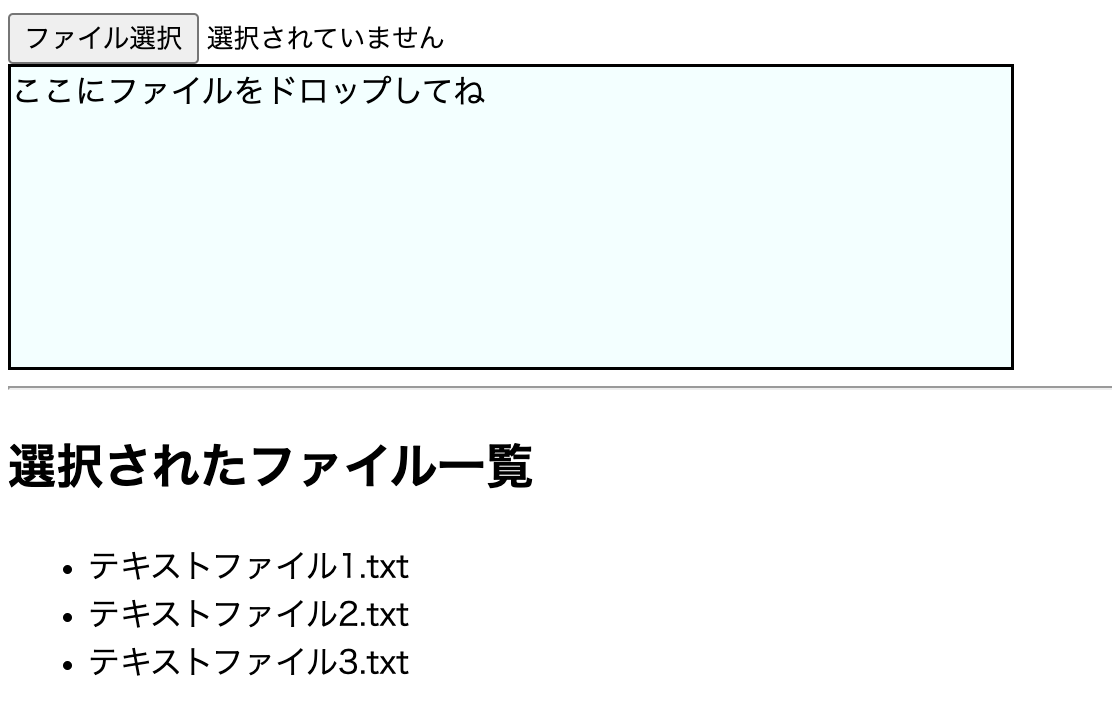 ユーザーがファイルを指定するには、input要素での選択かドラッグ&ドロップを利用します。ファイルは複数指定可能です。
