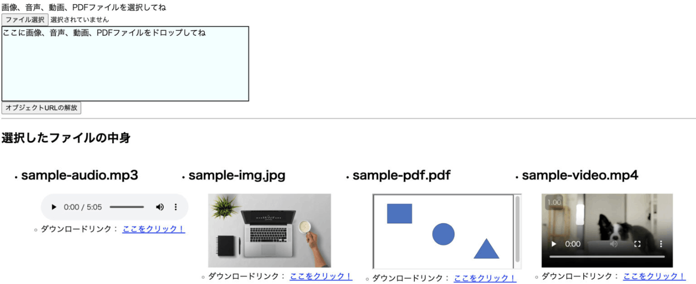 生成したオブジェクトURLをimg、audio、video、iframe要素などのsrc属性に指定することで画面に表示することができます。またa要素のhref属性に指定することでダウンロードリンクを生成することができます。
