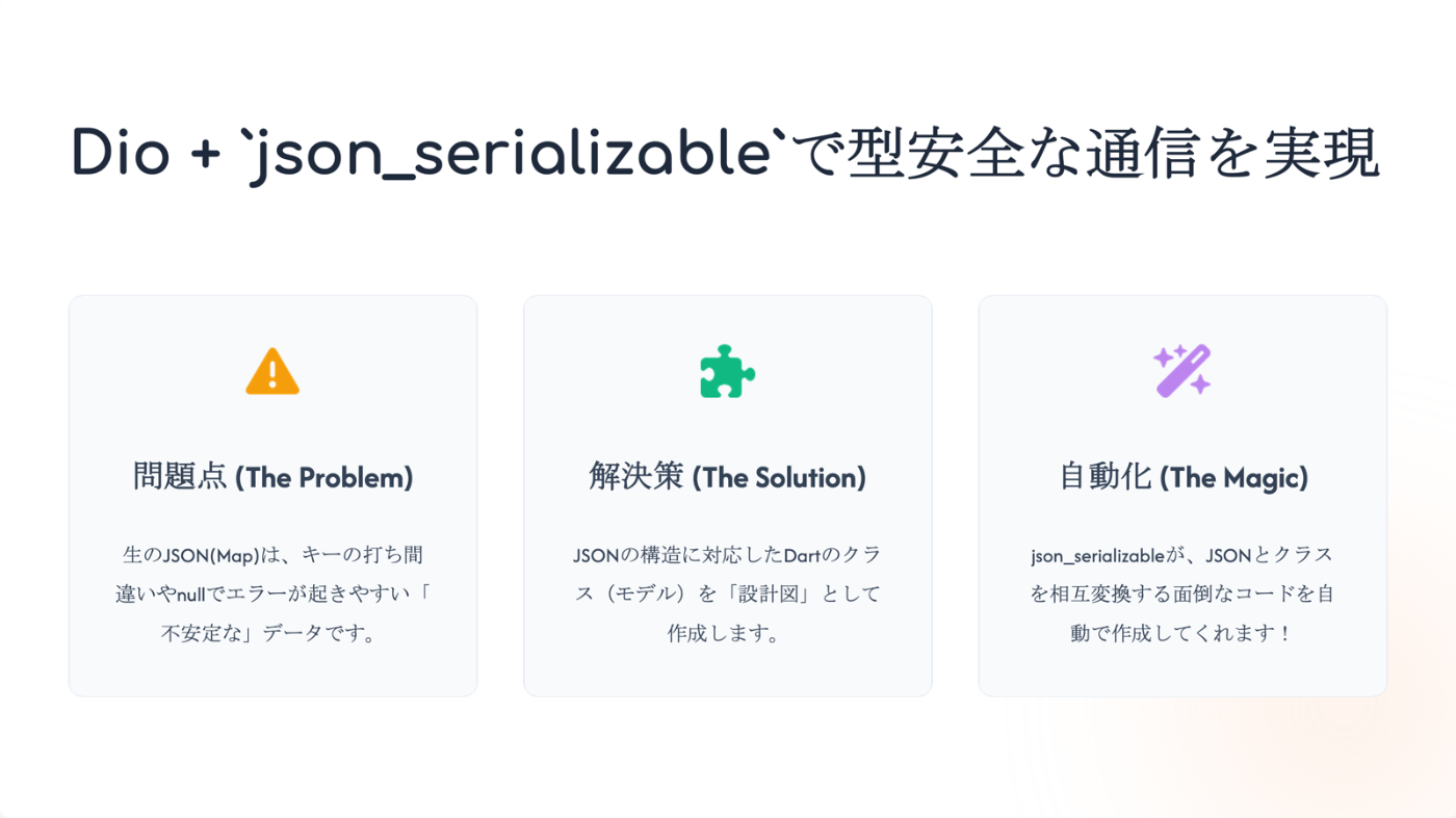 FlutterでAPI通信を行うなら、機能豊富で使いやすいDioがデファクトスタンダードです。この記事では、JSONのモデル化を自動化する json_serializable と組み合わせた、クリーンで型安全な通信のベストプラクティスを解説します。