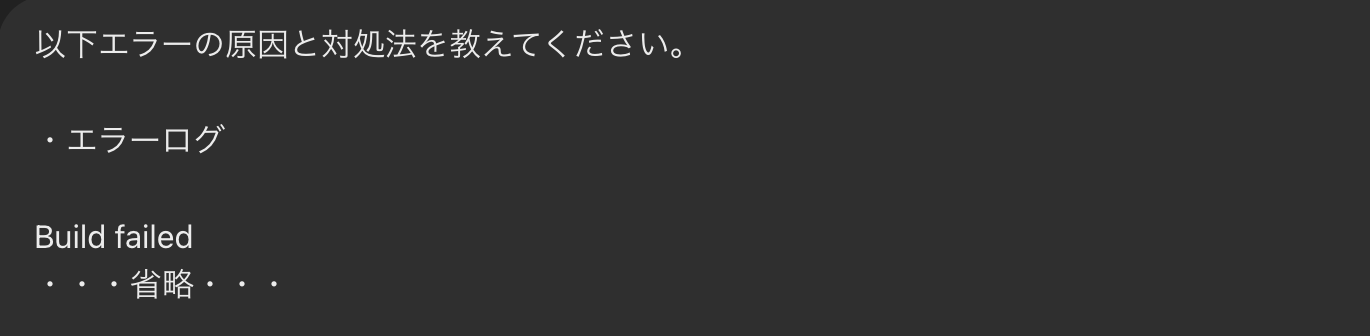 - エラーの原因がわからないときも、エラーコードを貼り付けるとChatGPTが素早く回答してくれました。ビルドの長いログも貼るだけで原因と対処法を教えてくれます。