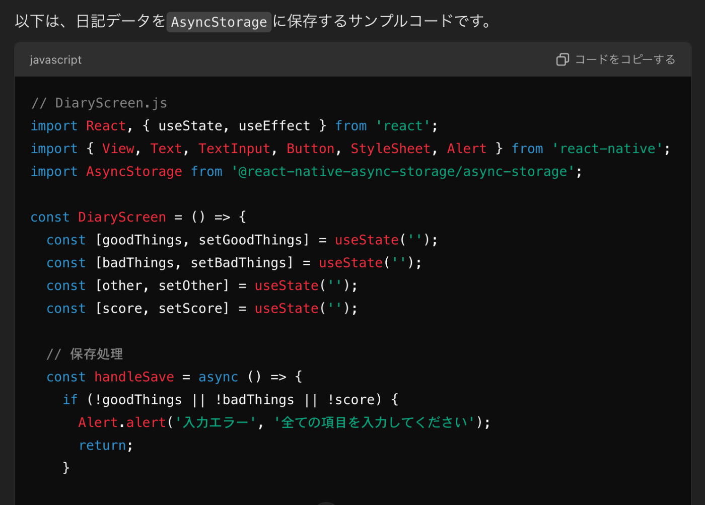データの保存にはAsyncStorageを採用。