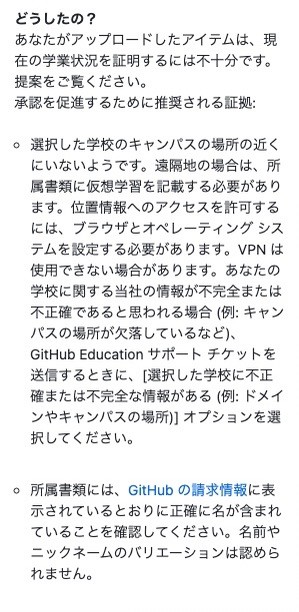 私はGithubがアメリカに拠点を置いていることから、請求情報にローマ字で記入しましたが、それが原因で学生証に書いてある名前と一致しなかったということだと思います。