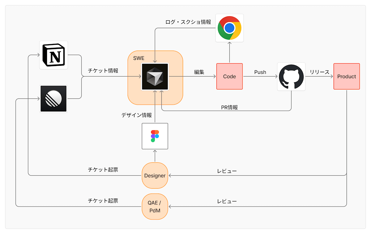ポイントは「SWE 以外のメンバーの指示やデータを AI が直接読み取り、コードに落とす」ことが前提になっている点です。