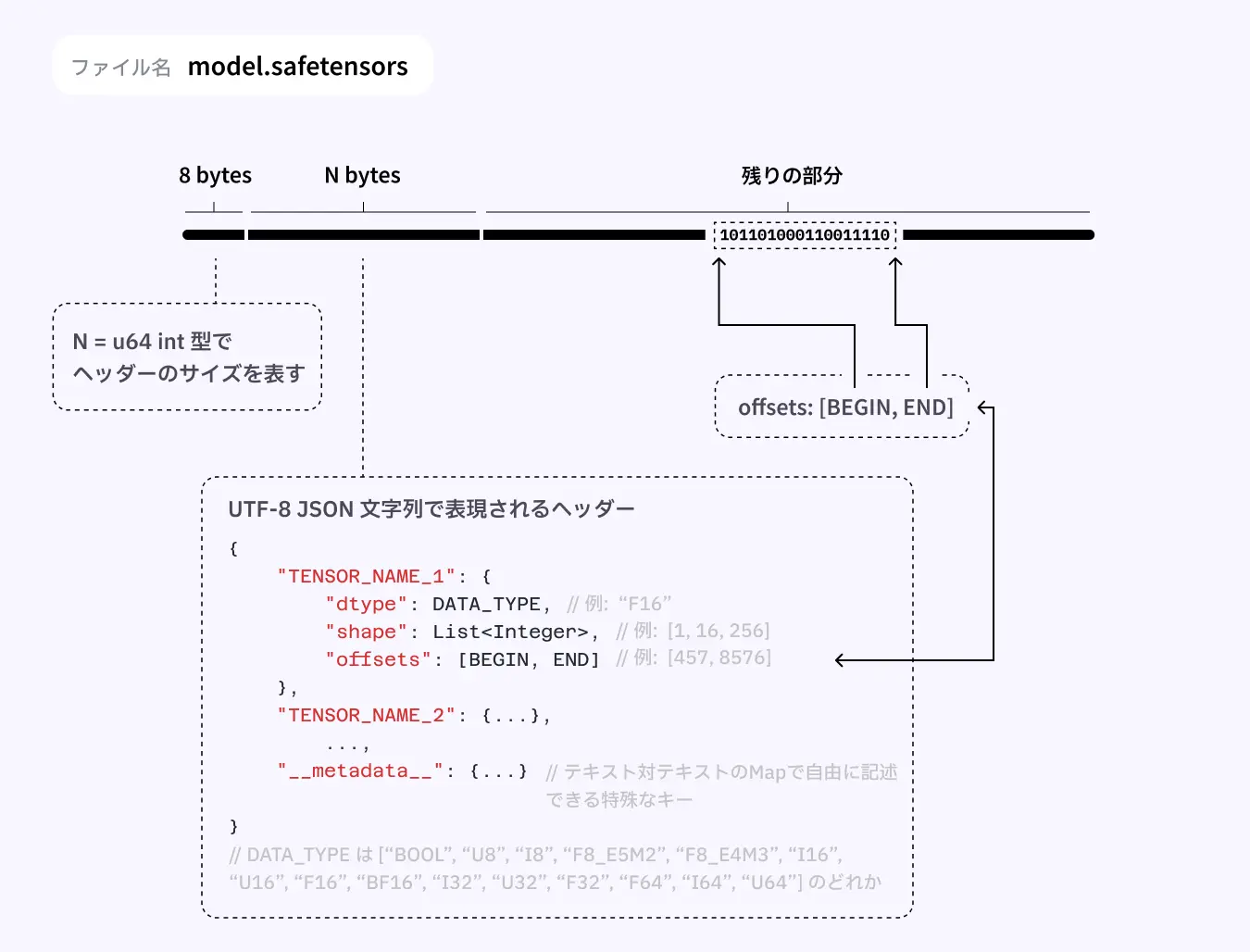 また、特殊なキーとしてオプショナルでメタデータを保存できる __metadata__ フィールドがあり、特に取り決めはないので自由に情報を入れることはできますが、 文字列: 文字列 のキーバリューペアにしなければならない という制約があります。ヘッダー自体は JSON 形式なのですが、__metadata__ では文字列型のみが使用可能となっている形なので、少し注意が必要です。