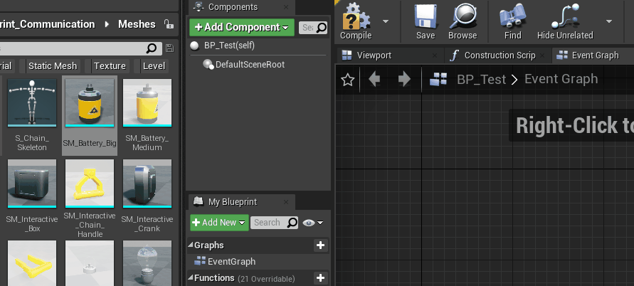 コンテンツブラウザから直接BPのコンポーネントウインドウ内にコンポーネントとして追加可能。また、コンポーネントウインドウからイベントグラフ内に追加可能。
