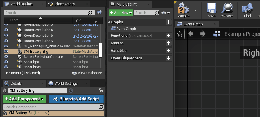 ちなみにアクターをWorld Outlinerで選択しておき、イベントグラフ内で右クリック [Create a Reference to] でも可能。