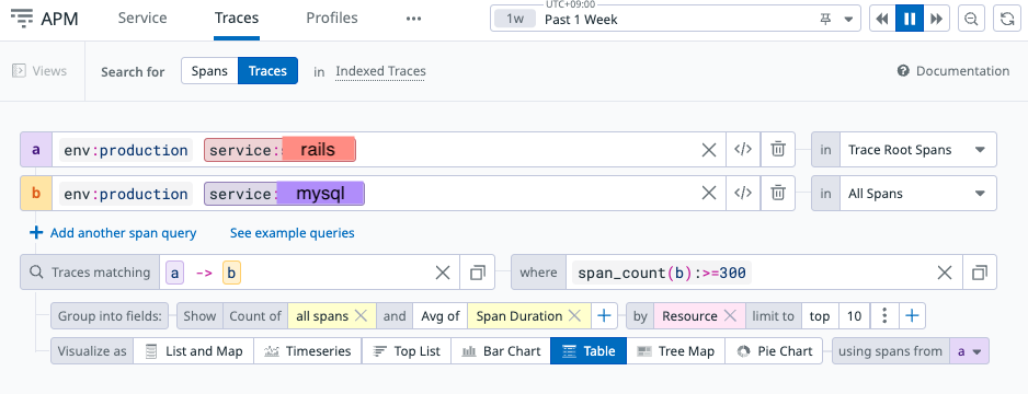 以下はクエリの例です。 Traces matchingフィールドで -> のトレースクエリ演算子 を使うことでrails サービスから呼び出される mysql サービスのSpanを検索しています。また、Resource ごとにグルーピングを行うことで、クエリの種類ごとに実行時間や件数を表示することができます。