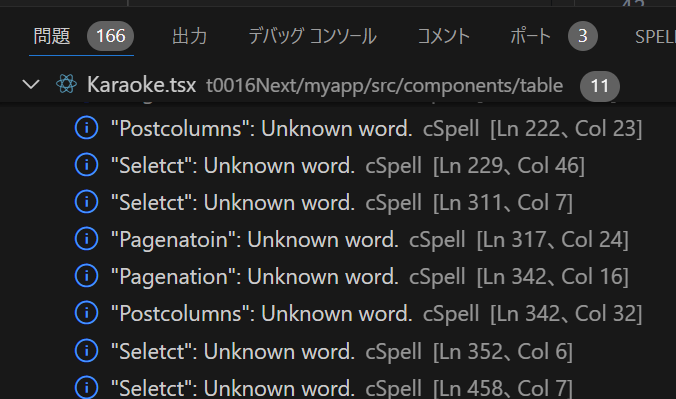 上述の通りホワイトリスト登録等をしたうえで、今も開発を続けている個人開発のソースコードの自分がコーディングしたファイル全てを開いたところ、160件以上の誤字が検出されました。
