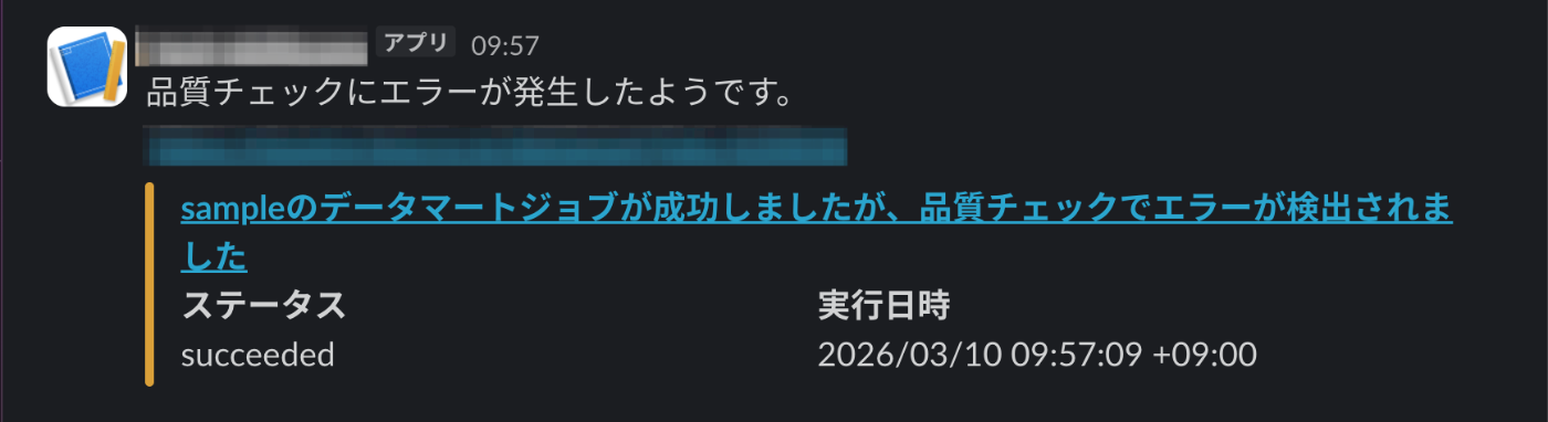 そんなときに役立つのが「ジョブ成功、かつ品質チェックエラー検出時」の通知です。