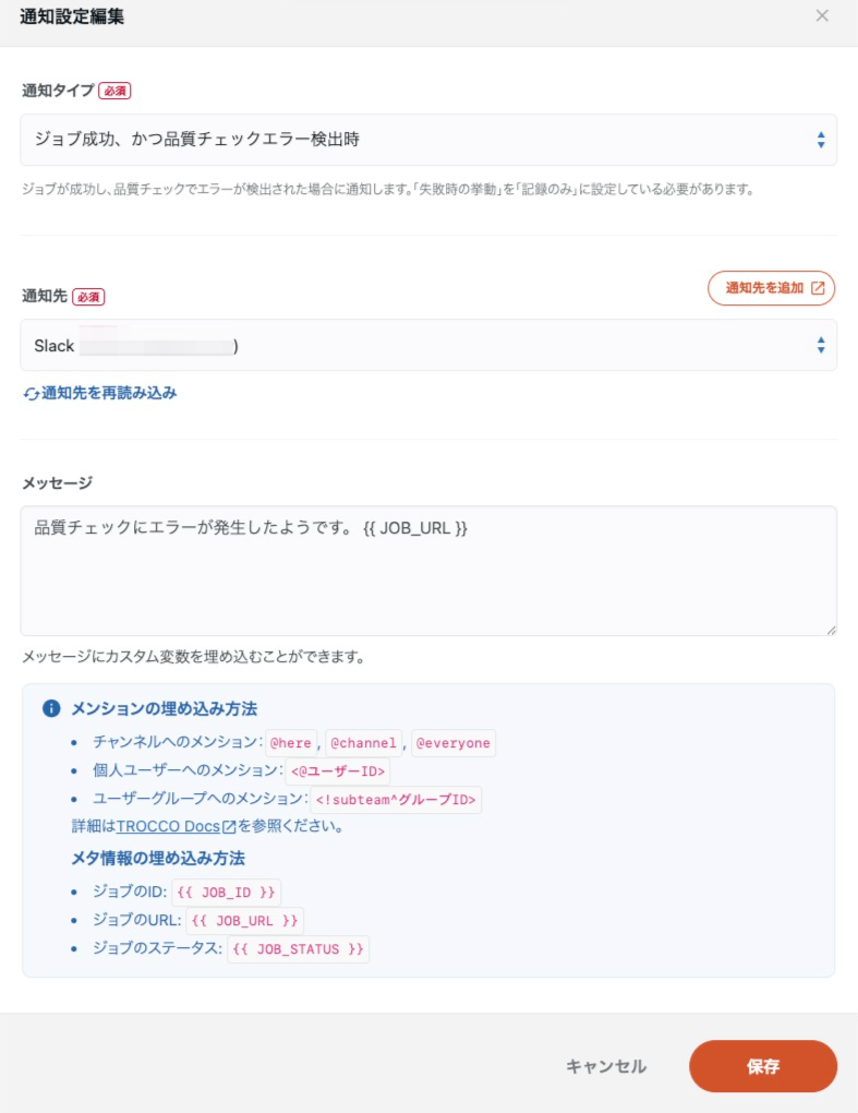 通知設定の新規作成画面から、通知タイプを「ジョブ成功、かつ品質チェックエラー検出時」にすることで、そんな状況のジョブが発生した際に通知を送ることができます。