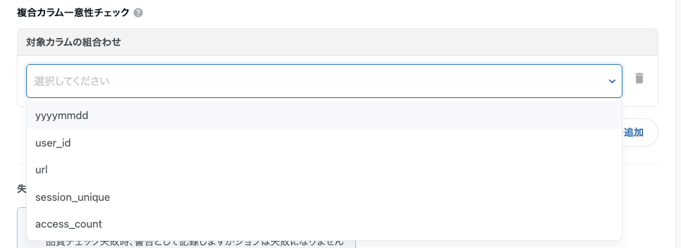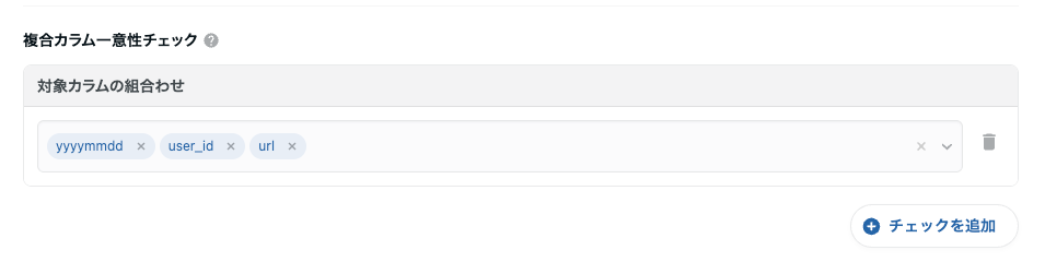 - ここから、「チェックを追加」を押下し、カラムの組み合わせを選択できます