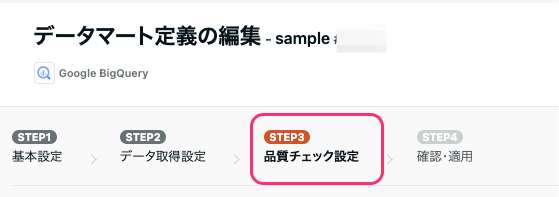 対象のデータマート定義を開き、「STEP3: 品質チェック設定」をクリックすることで既存のデータマート定義に品質チェックを追加することができます。