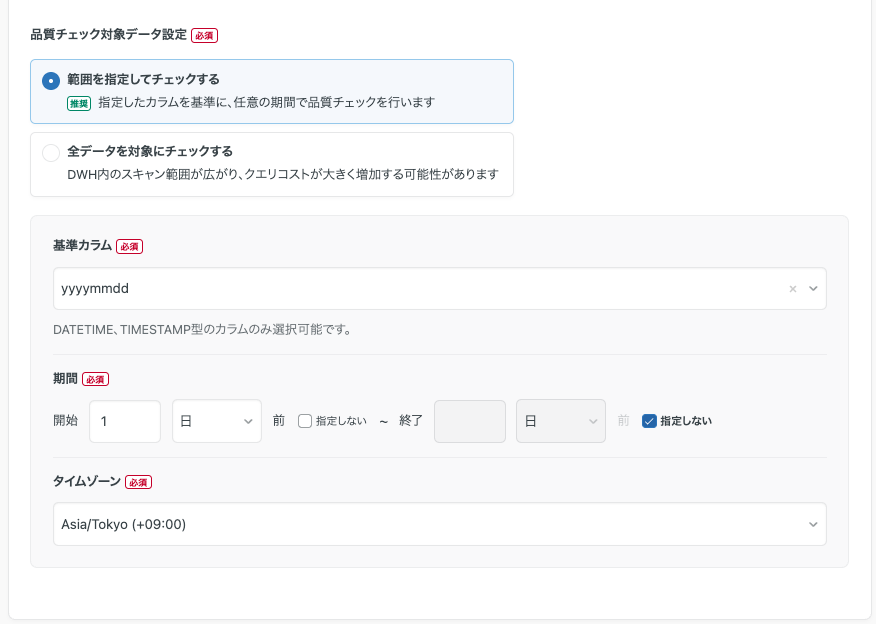 - 指定したカラムを基準に、任意の期間で品質チェックを行います。増分更新やSCD type2など、差分のみ更新している場合は、チェック対象を絞ることでDWHにかかる金銭的コストを抑えながらデータ品質の担保が可能です。