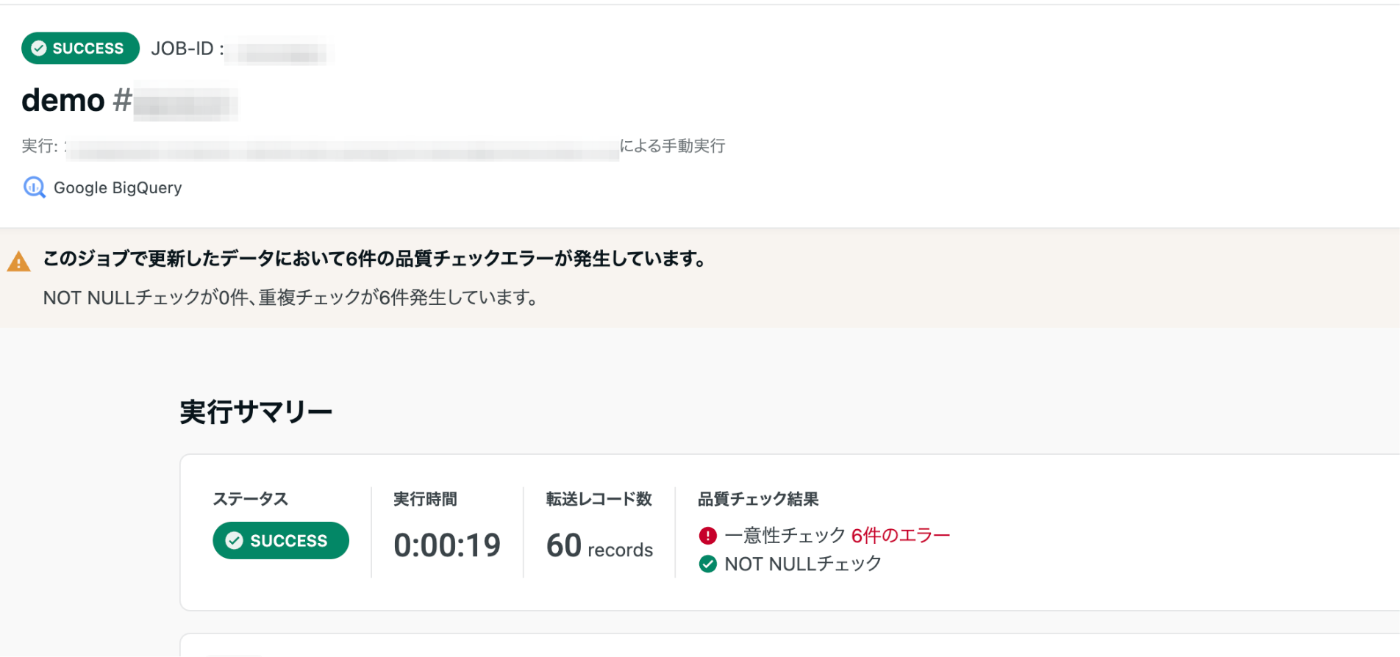 ジョブ自体は成功になっているものの、作成されたテーブルの品質に問題があることがわかりやすくなっています。