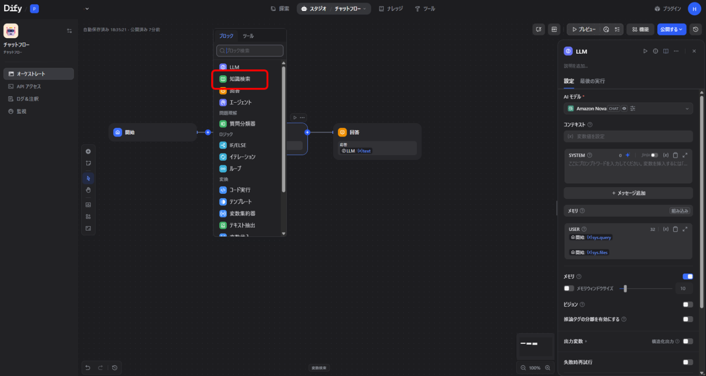 ここからが本記事のメインパートです。先ほど作成したチャットフローに、RAGを組み込んでいきます。