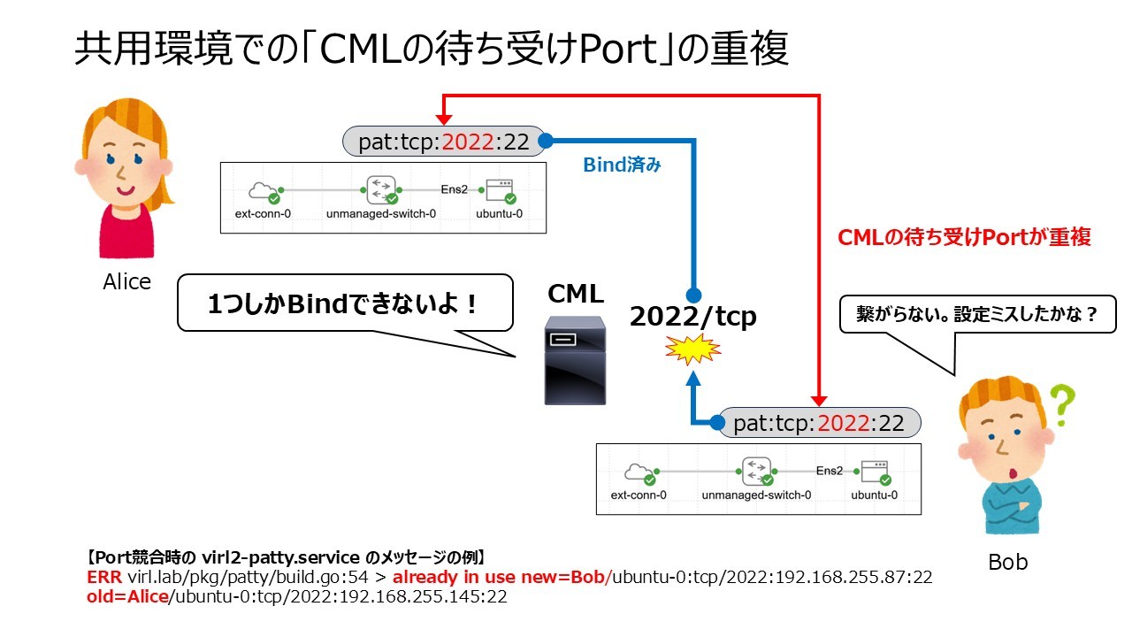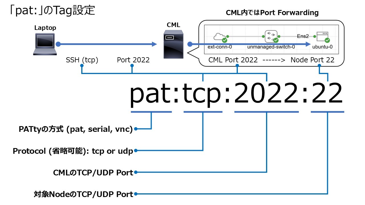 「pat:」は、Port Forwarding (DNAT: Destination NAT)の技術を用いて、「CML側のPort」と「Node側のサービス (例: SSH)」をマッピングするためのTagです。