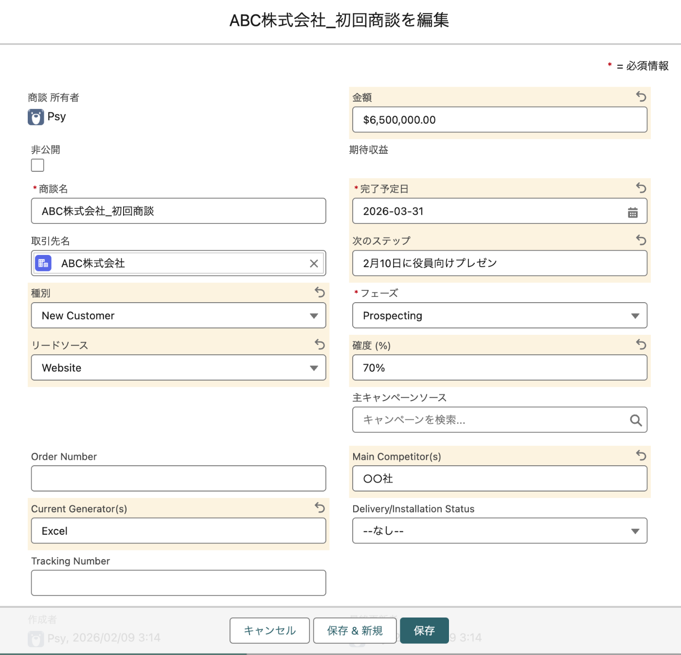 「フォームに入力」を押すと、Content ScriptがSalesforceの商談編集画面のフォームに値を自動入力します。入力後も保存はされていない状態なので、ユーザーが内容を最終確認してから保存ボタンを押します。