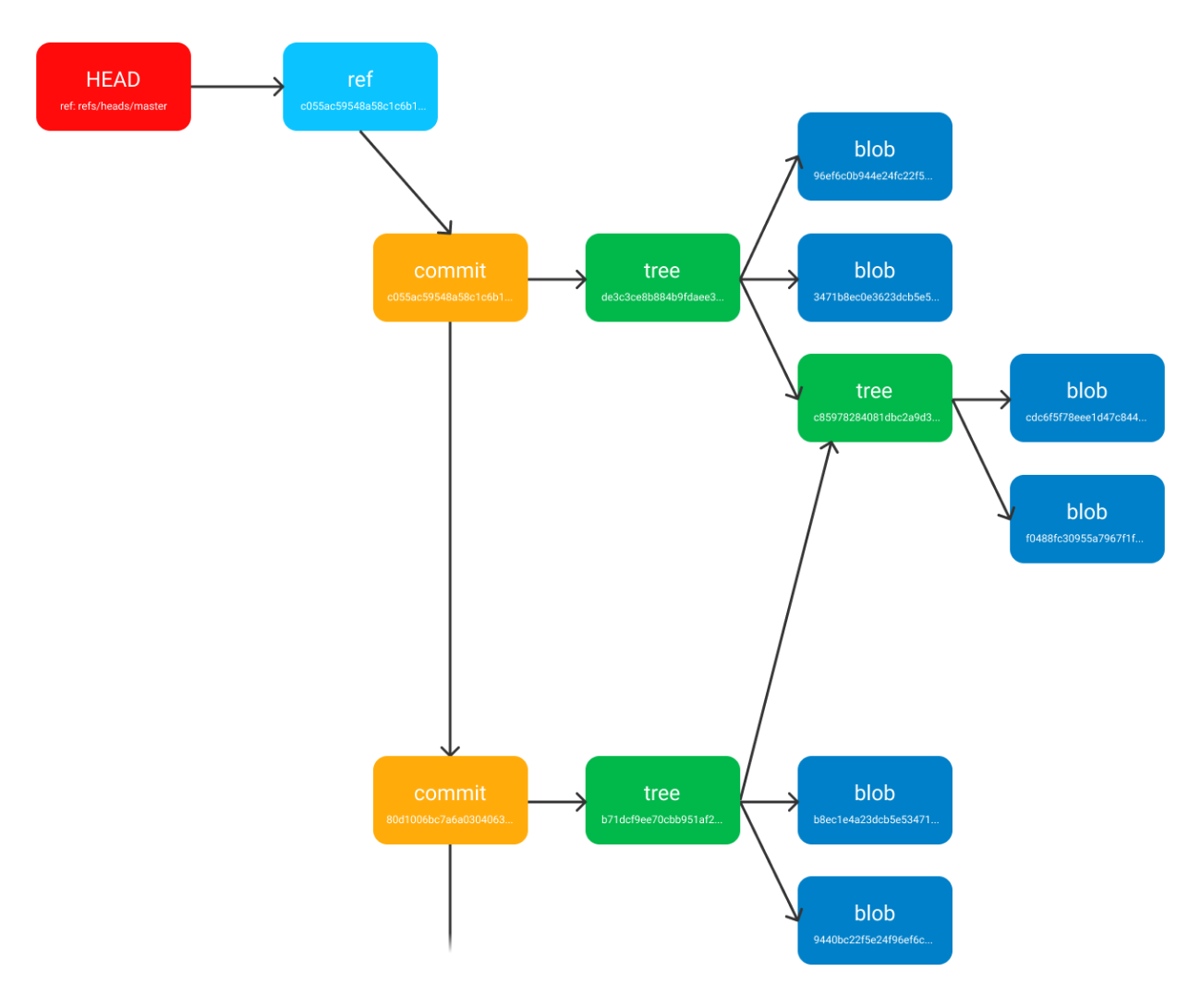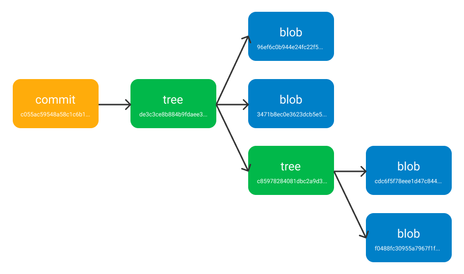 以上のように、Git のデータは commit、tree、blob の 3 種類の Git オブジェクトのみで構成されている。