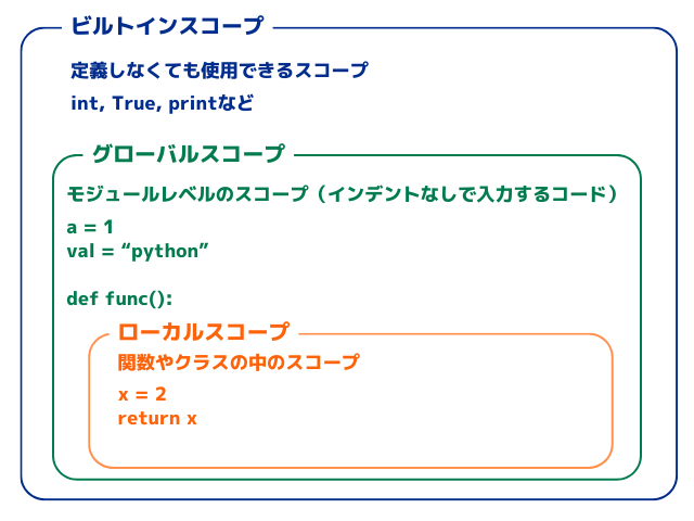 解説: Pythonのスコープにはローカルスコープ・グローバルスコープ・ビルトインスコープが存在し、ローカルスコープ➝グローバルスコープ➝ビルトインスコープの順に参照します。