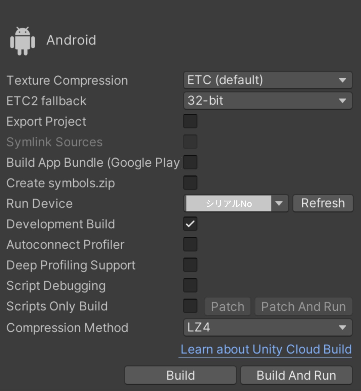 USBデバッグの許可ができていないときは、Unityのビルド設定ダイアログの「Run Device」のプルダウンメニューがシリアル番号になっています。