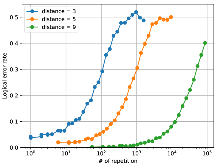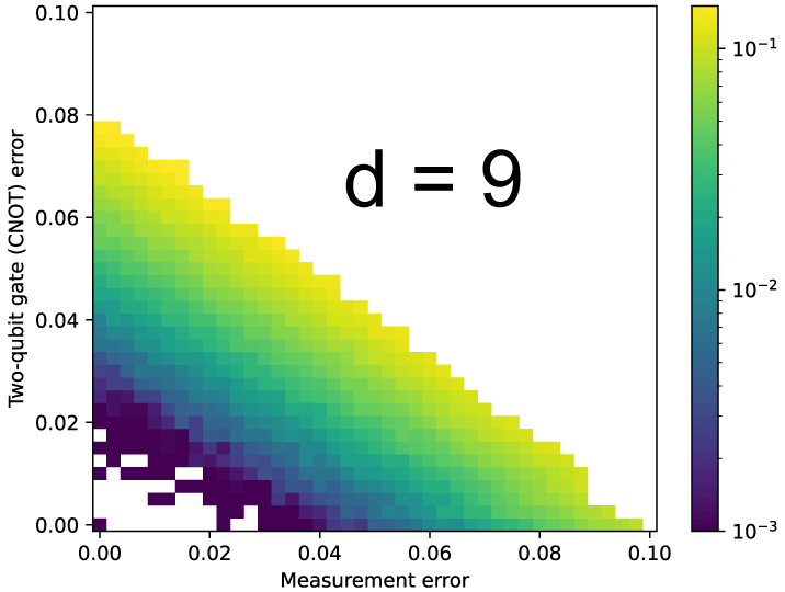 だいたい予想通り p_meas と p_cnot のトレードオフ関係が示されている。測定のエラー率が小さな場合には2量子ビットゲート(CNOT)のエラー率は大きくても許され、また逆もしかりである。また符号距離が大きくなった場合、損益分岐点を超える領域が広くなることも注目に値する。