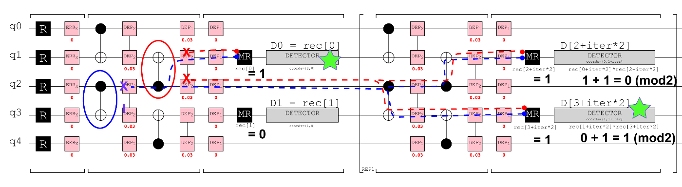 Q1-Q2のCNOT直後のXXエラー成分はQ1とQ2で同時にX反転が生じる(XY, YX, YYも同様)場合である。Q1のエラーは直後の測定と検出器 D0 によりエラーが検出されるが、Q2のエラーは1サイクル遅れ、検出器 D2 直前の測定 rec[2]と検出器 D3 の直前の測定 rec[3]が +1 となる(赤色の点線)。検出器 D2 は D2 直前の測定結果 (rec[2]=1) と D0 直前の測定結果 (rec[0]=1) の排他的論理和 (XOR) の結果によりシンドロームが生成されるため、検出器D2にホットシンドロームは生じない。検出器 D3ではQ2の反転エラーを検出する。このため復号グラフの辺D0-D3にp_cnot / 15 × 4パターンのエラー率が与えられる。