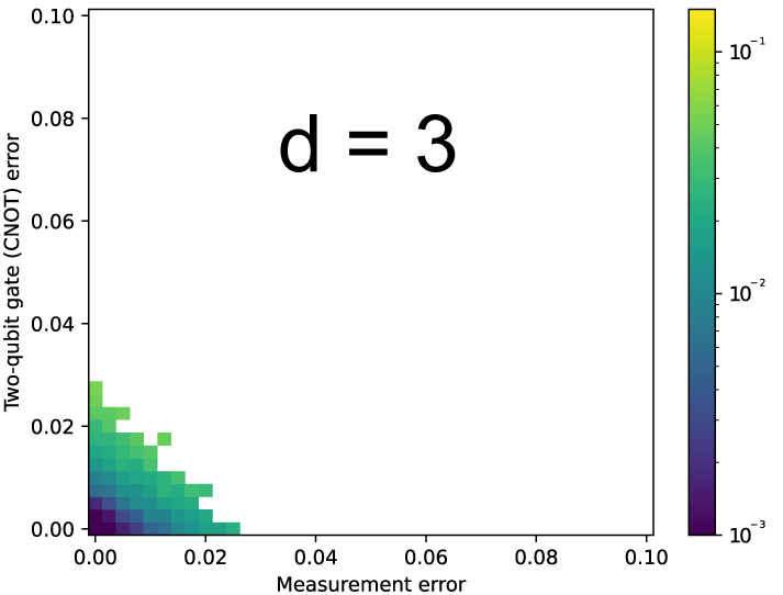 評価結果を上の3つの図に示す。図の描画の際に、(3 * d 回繰り返し時の論理エラー率) が繰り返し中に生じるエラー率 p_meas + p_cnot * 2 より大きな箇所は無効にしているため(In[64]の7行目、誤り訂正符号の実装意図とは逆に論理エラー率が増えたため)、d * 3回繰り返し時の損益分岐点を超える(損→益)程度に1回の繰り返しサイクルにおけるエラー率が小さな領域のみが描かれている。符号距離5と7の図において左下が白飛びしているのは、論理エラー率が8,192のシミュレーション回数では小さすぎて有効なデータが得られなかったためである。