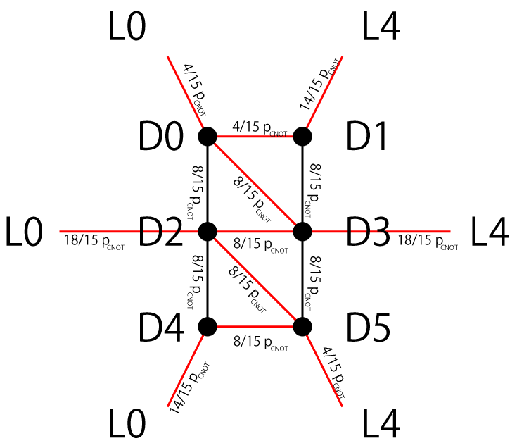 実際のところ、辺 D2-L0 や辺D1-L4はぴったり 18/15 p_cnot や 14/15 p_cnot の値に一致するわけではない。CNOTのエラー率 p_cnot を小さくすると漸近的にそれらの値に収束するため、p_cnot^2 の効果が取り込まれているようである。しかしどのような過程が入っているのか解析できなかった。力不足である。