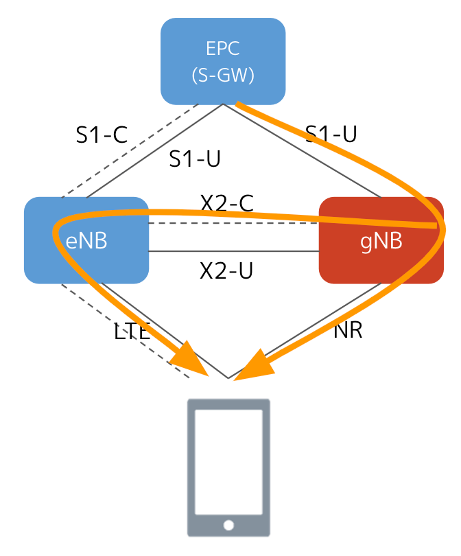 Core側からの大容量トラヒックをまずgNBが処理することで、eNB側の処理負荷を軽減するとともにスループット向上も可能です。C-Planeの処理はeNB側が担当し、gNBはU-Planeに対して専用システムとして振る舞うことになります。