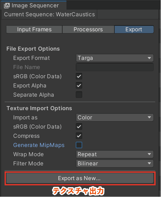 今回はコースティクスの連番画像32枚をUnityへインポートします。